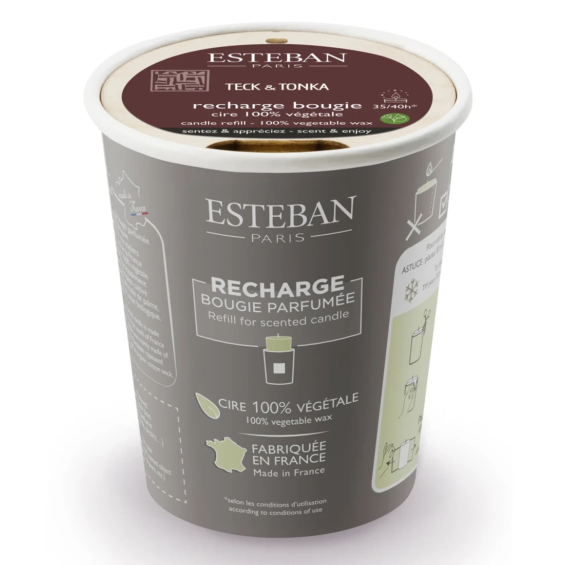 Recarga de velas perfumadas premium fabricadas a mano con ceras vegetales que no emiten humos, mechas de algodón y las mejores esencias. Con ello se obtiene un producto de alta calidad y respetuoso con el medio ambiente. Compatible con todas las velas Estéban Paris Parfums de 180 gramos.
